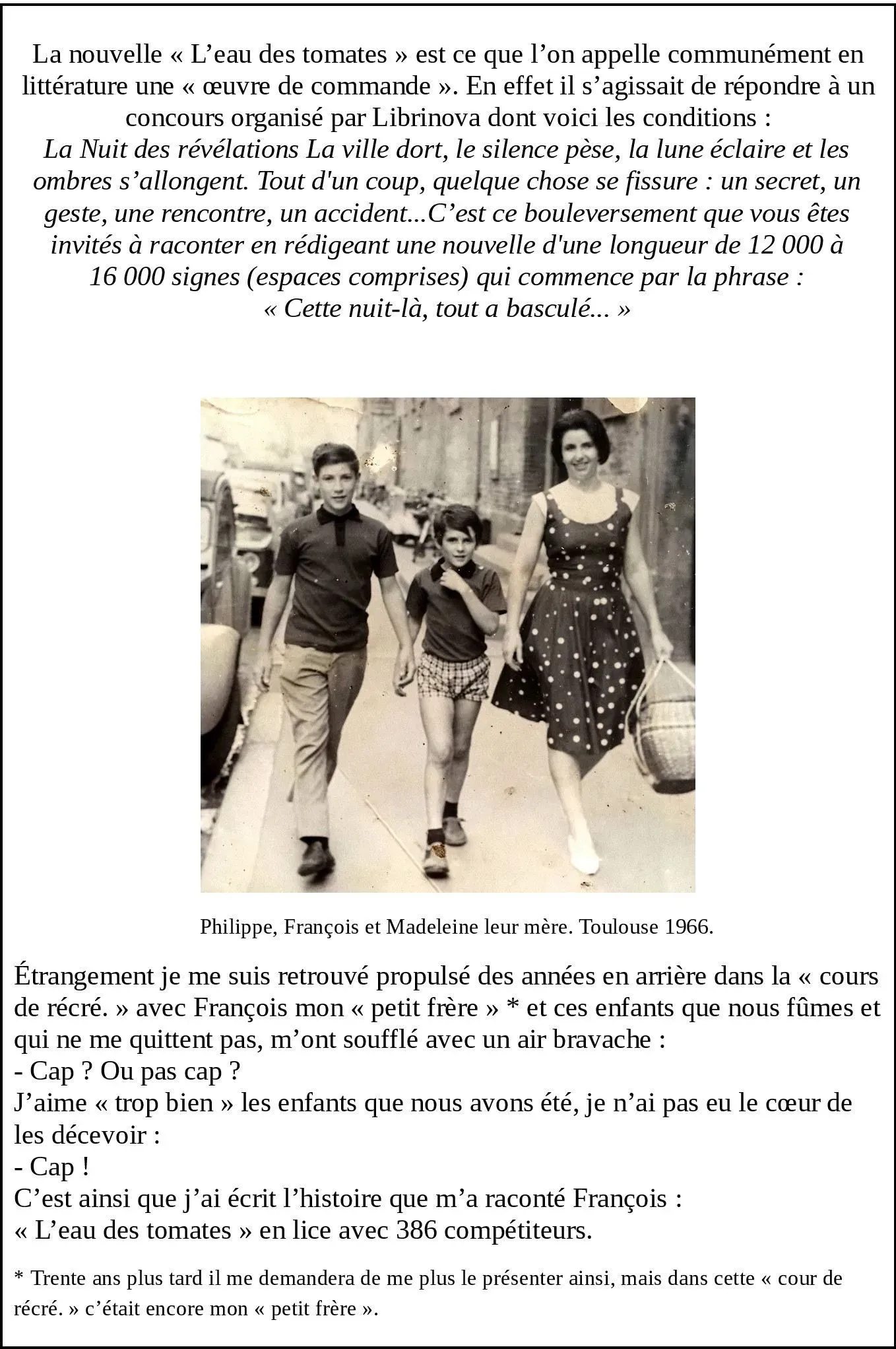 En 1966, l’instituteur lit ma rédaction en classe, il vante que c’est très imagé. J’ai toujours eu des dispositions en français mais cela n’est pour moi à cette époque qu’une discipline scolaire, un truc, une filouterie pour avoir de bonnes notes.